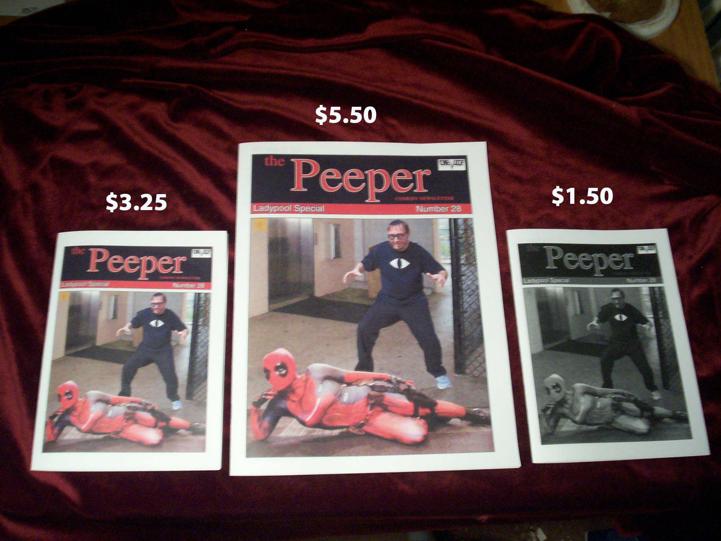 The Peeper comedy newsletter returns with Issue #28! This issue, Mr. Peepers runs into a female Deadpool cosplayer, who calls herself LADYPOOL! Can Peepers contain himself long enough to take photos of her for the Peeper? Includes 4 pages of her cosplay and Peepers raving about it! Also features a full interview with the cosplayer, and a Deadpool movie review by Mr. Peepers!