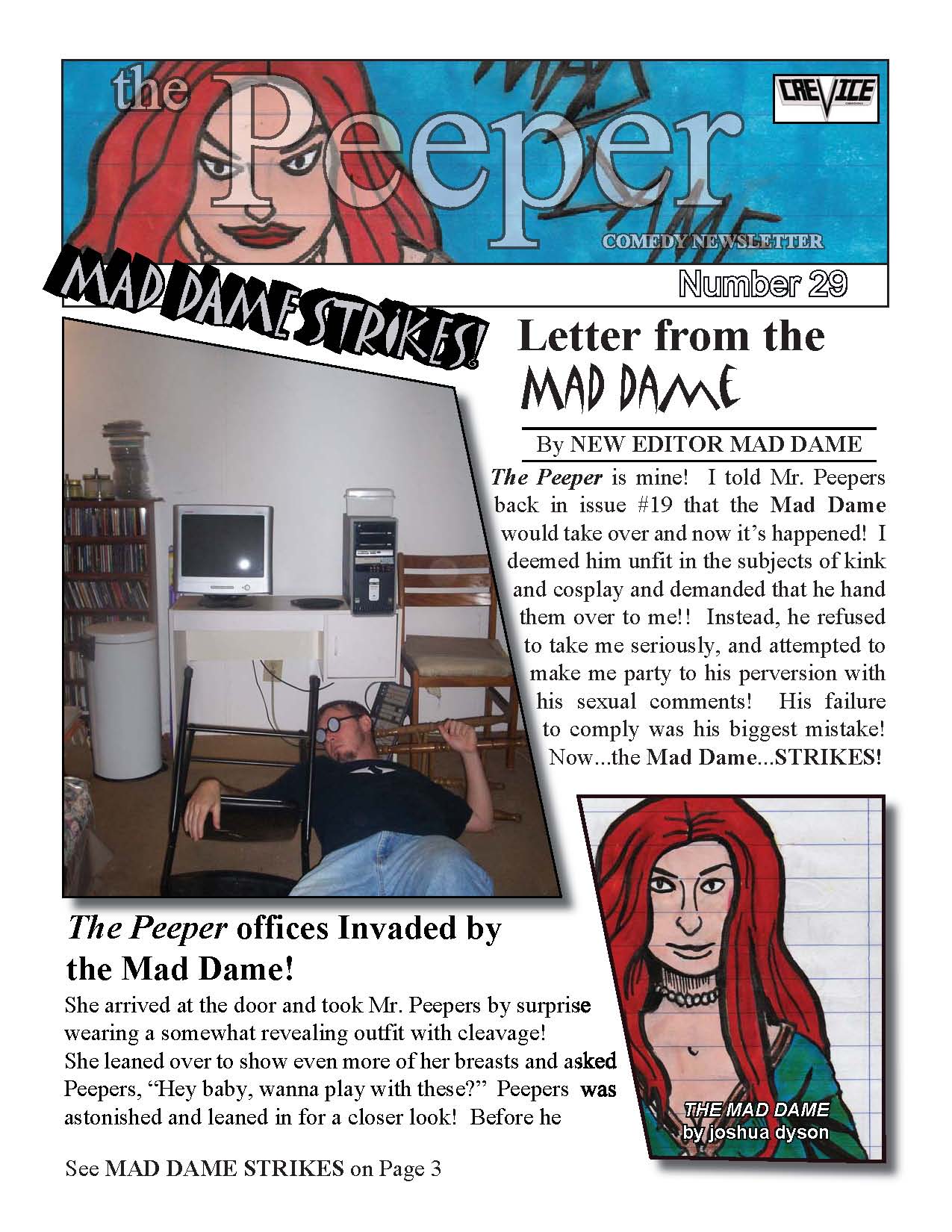 Mad Dame Strikes pt. 1 of 16! The Peeper letter writer from issue #26 attacks the Peeper office and kidnaps head writer, Josh! f/c 4 pg