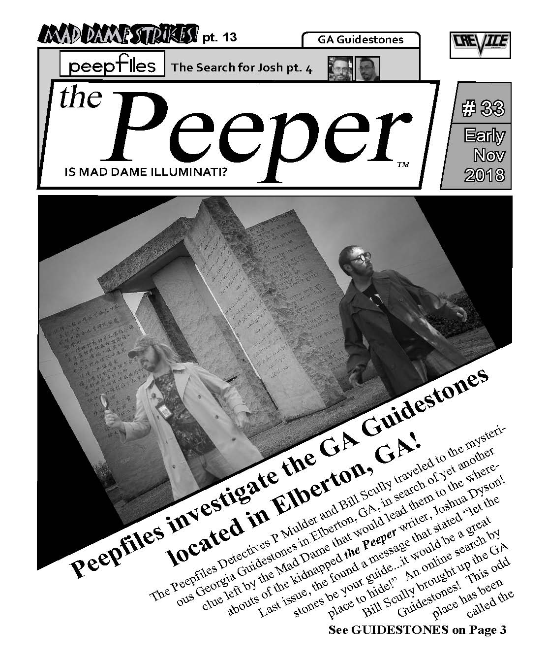 The Peeper comedy newsletter gets a new look with Issue #33! The Peepfiles follow yet another Mad Dame clue to locate the missing Josh! This one leads them to the mysterious GA Guidestones! Also featuring columns by Manlee Mann and the Hands of Time!